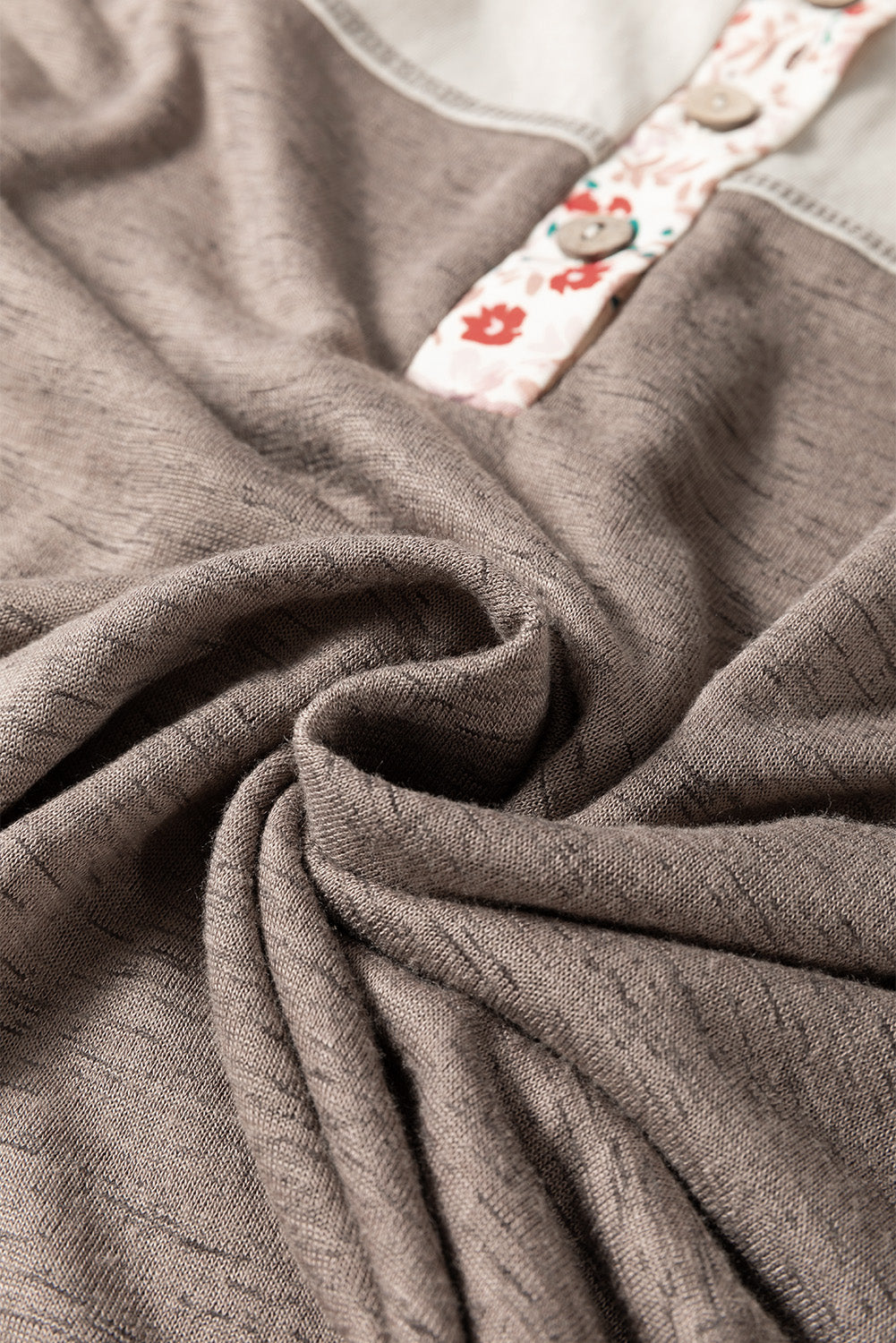 • Elevate your casual wardrobe with the Henley Top, blending a modern colorblock design with charming floral patchwork details.