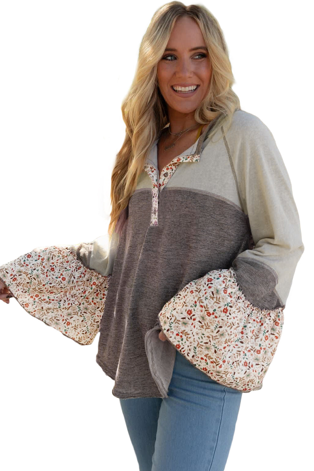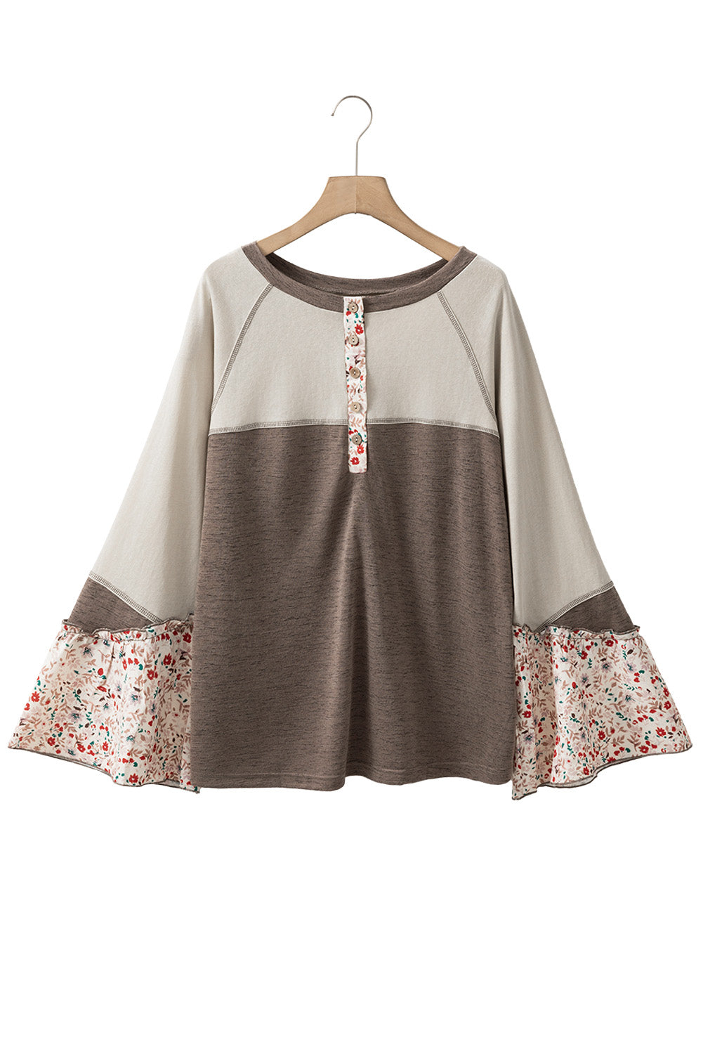Goat Colorblock Floral Patchwork Flared Sleeve Henley Top