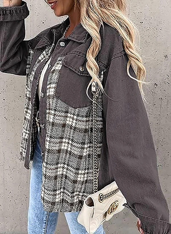 Women's Oversized Denim Shacket Jacket Plaid Long Sleeve Shirt Boyfriend Button Down Blouses Tops